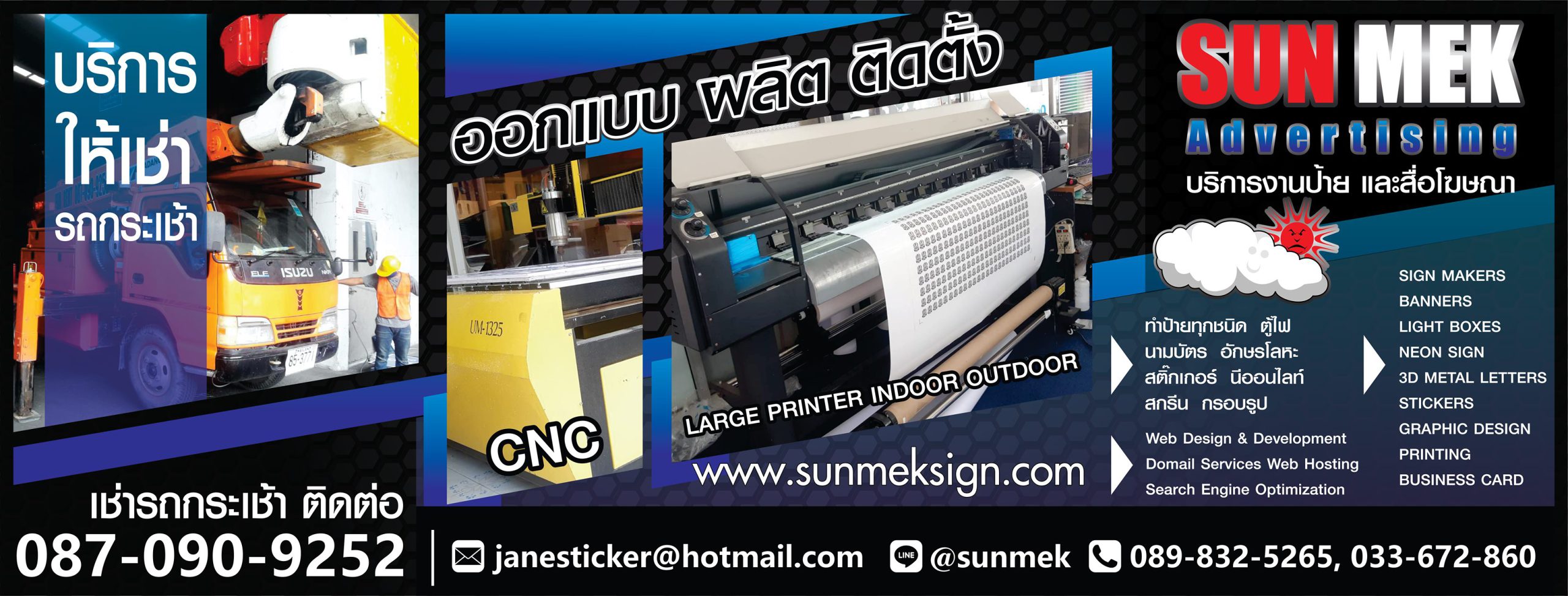 Sun-Mek เราผลิตสื่อโฆษณากลางแจ้งด้วยวัสดุคุณภาพสูงคงทน และมีเอกลักษณ์ เป็นสื่อกลางที่มีเสียงตอบรับที่ดีที่สุด เด่นและมองเห็นได้ชัดเจน คมทุกตัวอักษรและรูปที่มีความสวยงามที่สุด..... ได้ผลตอบรับจากลูกค้า และผู้สนใจได้มากที่สุดคือเราเท่านั้น>>>>>>>